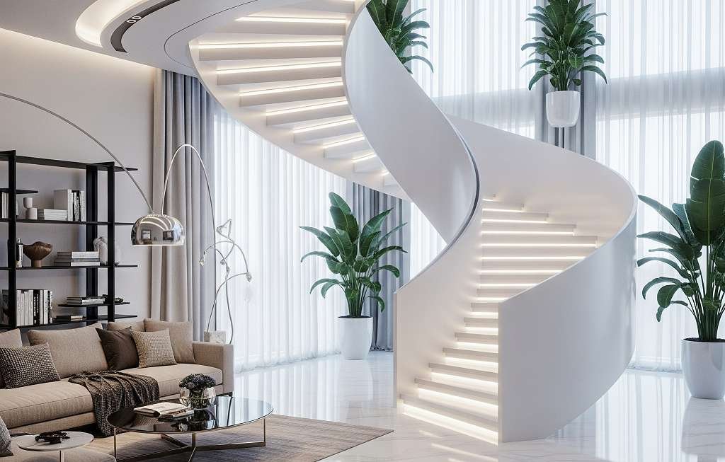 A spiral staircase is not only visually striking but also highly practical. It’s ideal for maximizing floor space while adding a sophisticated architectural touch.